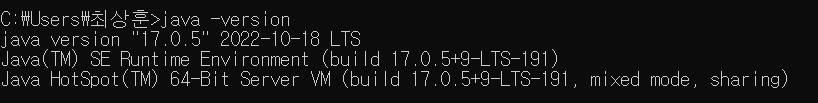 java -version 명령어를 입력해주어 자바가 잘 설치되어 있으면 자바의 버전을 확인 할 수 있다.