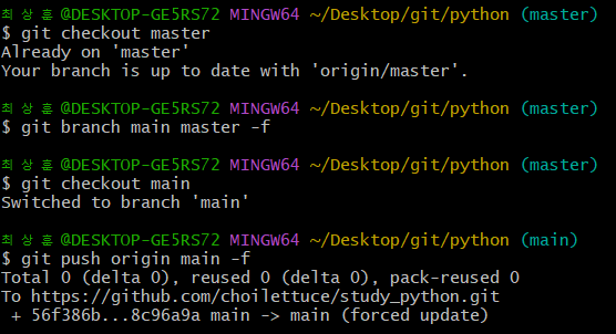 - git branch main master -f 명령어를 통해 강제로 commit 한다.